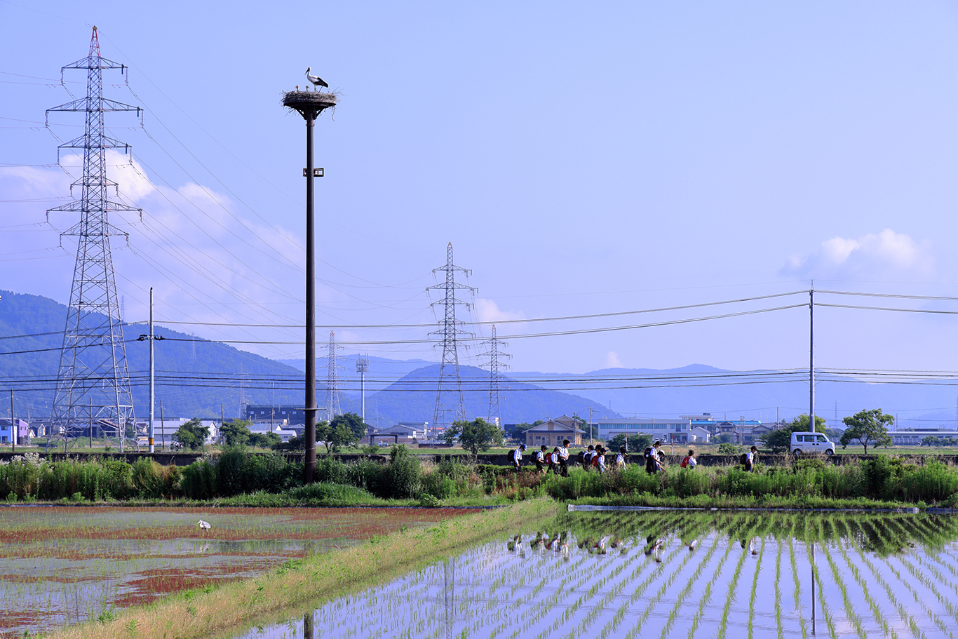 - 散歩や通学など地域の生活行動とコウノトリとが共生している典型的な風景です。