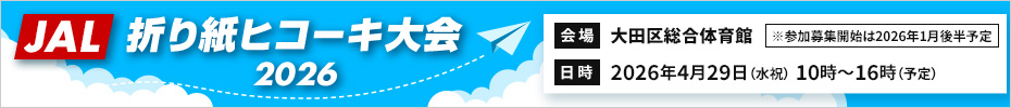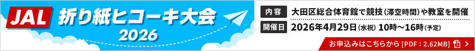 「折り紙ヒコーキ」は、だれでも手軽に楽しめる遊びです。「1枚の紙がおどろくほど風に乗って飛んでゆく」、それが「折り紙ヒコーキ」です。2020年に開催される「第3回 JAL折り紙ヒコーキ全国大会」に向け、各地で予選会を開催予定。全国大会への出場選手を決定します。